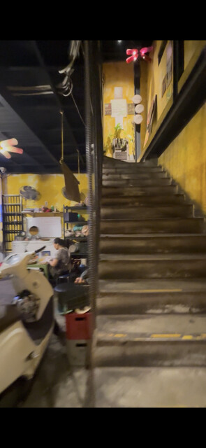細い通路を入ると1Fは倉庫の様なキッチン、階段を上がると2-4Fが店内。