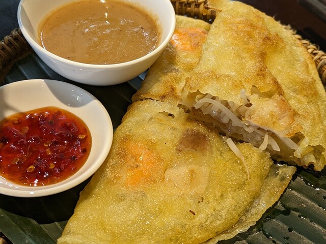 まずはバインセオ。ベトナムじゅうで食べられている国民食ですが、地方によって食べ方は少々異なり、ダナンにおいてはライスペーパーで巻いて食べるのが主流です。