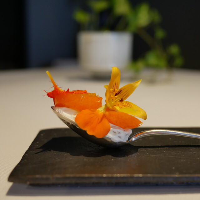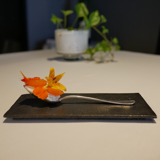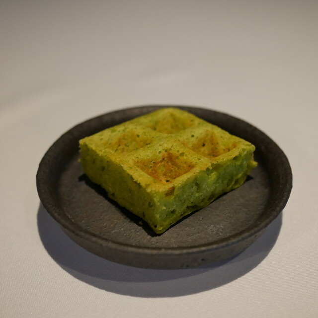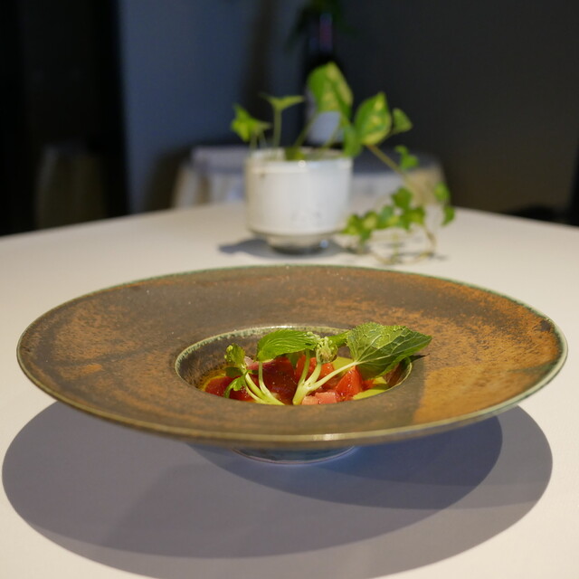 塩釜産天然本鮪と垢田トマトのマリネ 花山葵の香り ワッフル