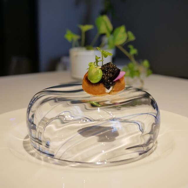 仏産ライ麦のブリニとサワークリーム/仏産キャビアと空豆