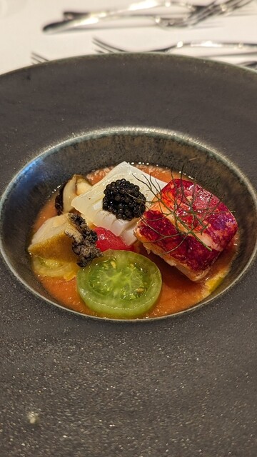 阿武町トマト火入れして冷やしたガスパチョとトマトのマリネの酸味をベースに赤烏賊、サザエ、蝦夷鮑の食感と旨み、キャビアの塩気が重なり味わい深い一皿に。