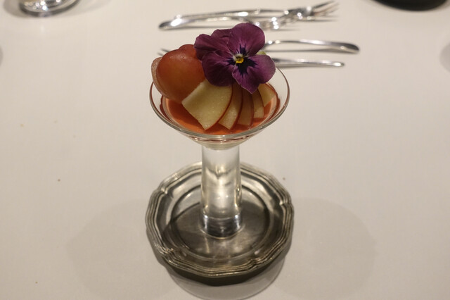 フルーツとチーズの組み合わせが新鮮で、シャインマスカットとマイハートの2種類の葡萄が爽やかな甘味を添えています。ちなみに、シェフのお婆様は葡萄農家だったんだとか。