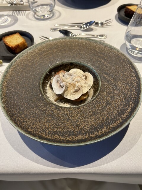 仏産帆立貝のソテーと徳山産鮑/瀬戸内の芝海老のフリット/フランス産と山口産キノコのフリカッセ/シャンパンヴィネガーのクリームと仏産キノコのヴルーテ